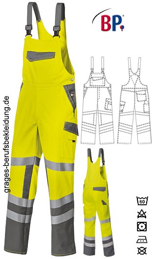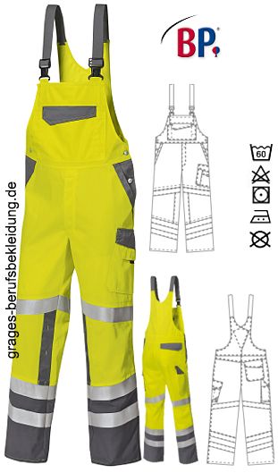 Ca. 270 g/m², 60° waschbar, BP Warnschutzkleidung warngelb /dunkelgrau, Stretchträger mit Kunststoff-Steckschnallen, doppelte Latztasche mit Patte verschließbar, davon 1 mit verdecktem Reißverschluss, 2 Stifttaschen, 2 Seitentaschen, Schenkeltasche mit aufgesetzter Smartphone- und Stifttasche, Schenkel- und Smartphonetasche mit Patte verschließbar, hochgezogener Rücken, freihängende doppelte Zollstocktasche, 1 mit Patte verschließbare Gesäßtasche, je 2 umlaufende Reflexstreifen auf dem unteren Bein, je 1 umlaufender Reflexstreifen auf dem oberen Bein, Bundweite regulierbar durch verstellbaren Stretchkeil BP Flex, Knieeinschubtaschen für Kniepolster 1839 000 53 (bitte separat bestellen), integrierter UV Schutz nach Standard 801, DuraClean Ausrüstung zur besseren Schmutzablösung, Schrittlänge ca. 81 cm, Öko-Tex Standard 100, Industriewäsche-geeignet nach ISO 15797, 360° Sichtbarkeit, Gr. 44n-64n, 48l-54l, 48s-56s
