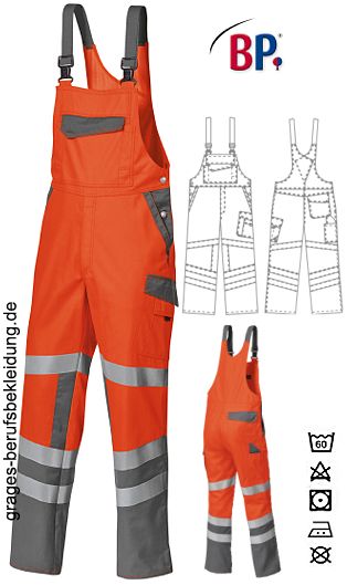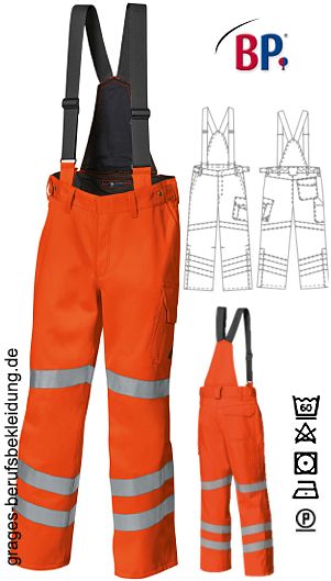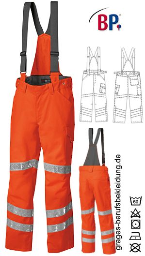 Ca. 350 g/m², 60° waschbar, BP Warnschutzkleidung warnorange, abzippbarer hochgezogener Rücken mit extra breiten, abknöpfbaren Trägern, rückwärtiger, mit Knöpfen verstellbarer Dehnbund, 2 Seitentaschen, Schenkeltasche mit aufgesetzter Smartphonetasche, Schenkel- und Smartphonetasche mit Patte verschließbar, 1 Zollstocktasche, 1 mit Patte verschließbare Gesäßtasche, vorgeformtes Bein, je 2 umlaufende Reflexstreifen auf dem unteren Bein, je 1 umlaufender Reflexstreifen auf dem oberen Bein, Beinabschluss mit seitlichem Reißverschluss für bequemes An- und Ausziehen, zusätzlich mit Patte wasserdicht verschließbar, 2-Lagen-Direktlaminat, wasserdicht, winddicht, Tragekomfort durch hohe Atmungsaktivität, EN 343 Kl. 3/3; EN ISO 20471 Kl. 2; EN ISO 11611 cl.1 - A1; EN ISO 11612 A1, B2, C2, F1; EN 1149-5; EN 61482-1-2 cl.2; EN 13034-6, inhärenter Flammschutz, Schrittlänge ca. 82 cm, Öko-Tex Standard 100, Industriewäsche-geeignet nach ISO 15797, LIEFERUNG ERFOLGT OHNE GÜRTEL, Gr. XSn-3XLn