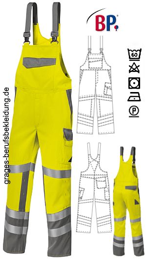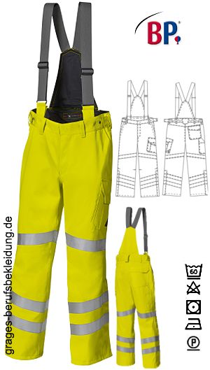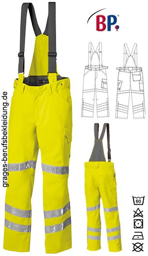 Ca. 350 g/m², 60° waschbar, BP Warnschutzkleidung warngelb, abzippbarer hochgezogener Rücken mit extra breiten, abknöpfbaren Trägern, rückwärtiger, mit Knöpfen verstellbarer Dehnbund, 2 Seitentaschen, Schenkeltasche mit aufgesetzter Smartphonetasche, Schenkel- und Smartphonetasche mit Patte verschließbar, 1 Zollstocktasche, 1 mit Patte verschließbare Gesäßtasche, vorgeformtes Bein, je 2 umlaufende Reflexstreifen auf dem unteren Bein, je 1 umlaufender Reflexstreifen auf dem oberen Bein, Beinabschluss mit seitlichem Reißverschluss für bequemes An- und Ausziehen, zusätzlich mit Patte wasserdicht verschließbar, 2-Lagen-Direktlaminat, wasserdicht, winddicht, Tragekomfort durch hohe Atmungsaktivität, EN 343 Kl. 3/3; EN ISO 20471 Kl. 2; EN ISO 11611 cl.1 - A1; EN ISO 11612 A1, B2, C2, F1; EN 1149-5; EN 61482-1-2 cl.2; EN 13034-6, inhärenter Flammschutz, Schrittlänge ca. 82 cm, Öko-Tex Standard 100, Industriewäsche-geeignet nach ISO 15797, LIEFERUNG ERFOLGT OHNE GÜRTEL, Gr. XSn-3XLn