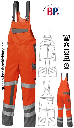 Ca. 270 g/m², 60° waschbar, BP Warnschutzkleidung in warnorange/dunkelgrau, Stretchträger mit Kunststoff-Steckschnallen, doppelte Latztasche mit Patte verschließbar, davon 1 mit verdecktem Reißverschluss, 2 Stifttaschen, 2 Seitentaschen, Schenkeltasche mit aufgesetzter Smartphone- und Stifttasche, Schenkel- und Smartphonetasche mit Patte verschließbar, hochgezogener Rücken, freihängende doppelte Zollstocktasche, 1 mit Patte verschließbare Gesäßtasche, je 2 umlaufende Reflexstreifen auf dem unteren Bein, je 1 umlaufender Reflexstreifen auf dem oberen Bein, Bundweite regulierbar durch verstellbaren Stretchkeil BP Flex, Knieeinschubtaschen für Kniepolster 1839 000 53 (bitte separat bestellen), integrierter UV Schutz nach Standard 801, DuraClean Ausrüstung zur besseren Schmutzablösung, Schrittlänge ca. 81 cm, Öko-Tex Standard 100, Industriewäsche-geeignet nach ISO 15797, 360° Sichtbarkeit, Gr. 44n-64n, 46l-56l, 48s-56s